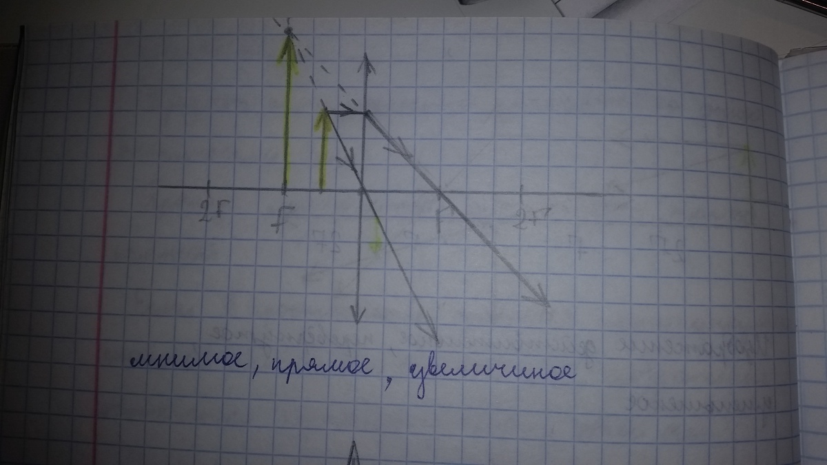 Во втором случае, предмет находится между F и 2F далее проводишь линию через оптический центр (О) потом от предмета до линзы параллельную прямую главной оптической оси и от места где эта прямая пересекается с линзой проводишь прямую через F
