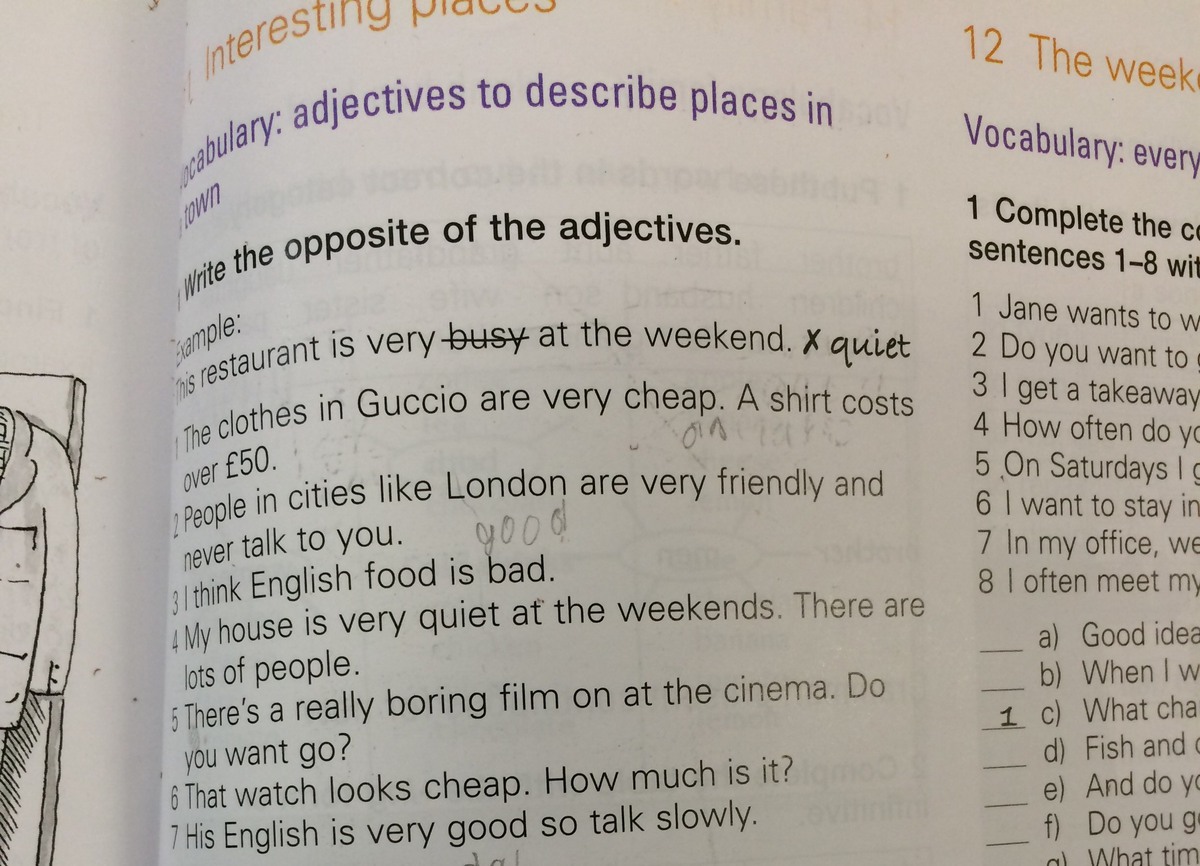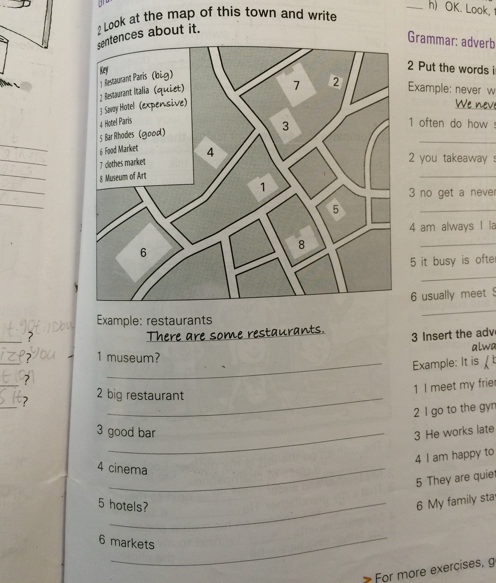 С 3 фото не совсем понял задание, скорей всего нужно написать предложения с подходящими зданиями из списка. (Например в 3 пункте просят выписать большой (big) ресторан. Значит бери номер 1 из списка)