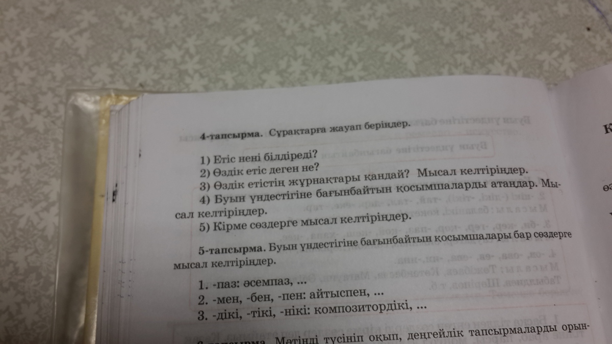 4.Көмектес септік жалғауы, тəуелдік мағынадағы септік, зат есімнің рең мəнін тудыратын жұрнақтар, белгілі бір сөздерге жалғанатын шет тілінен енген жұрнақтар