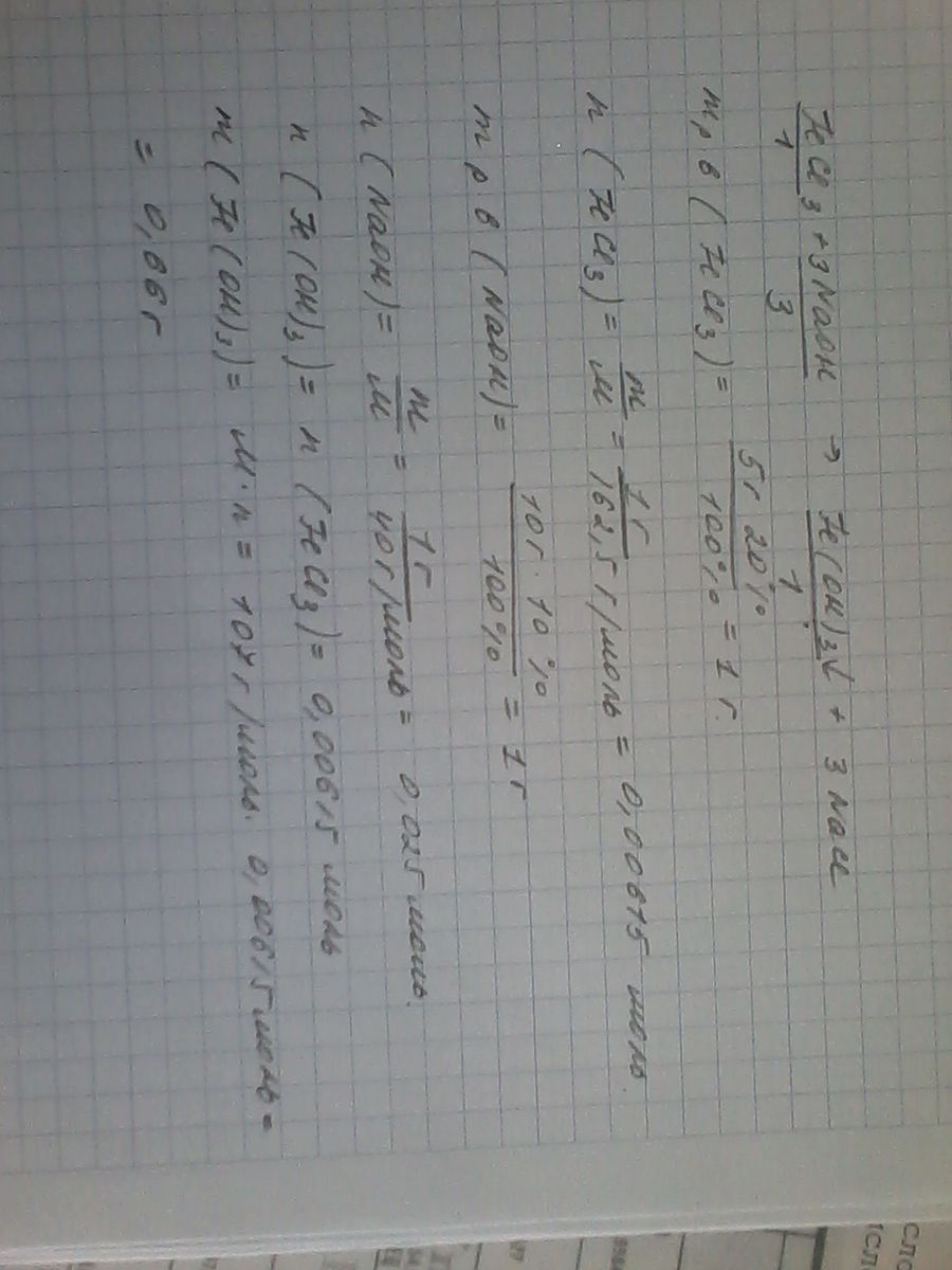 какое вещество и сколько его по массе выпадает в осадок при взаимодействии 5г 20%-ного раствора хлорида железа (3)и 10г 10%-ного раствора гидроксида натрия?