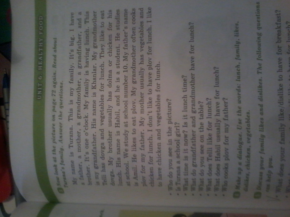 Посмотрите на картинку на страницу 72 еще раз. Прочитайте о семье Тураны. Ответьте на вопросы.