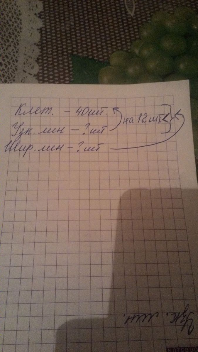 На столе учителя лежало 40 тетрадей в клетку, в узкую линейку на 12 меньше,а широкую линейку столько, сколько тетрадей в клетку и в узкую линейку вместе. Сколько тетрадей широкую линейку лежат на столе? помогите пожалуйста написать условие задачи. Ответ и решение знаем 40-12=28(т) в узкую, 40+28=68(т)широкую
