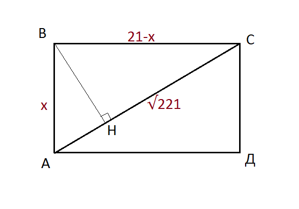 периметр прямоугольника равен 42 корень а диагональ равна корень из 221.найдите пплошадь этого прямоугольного