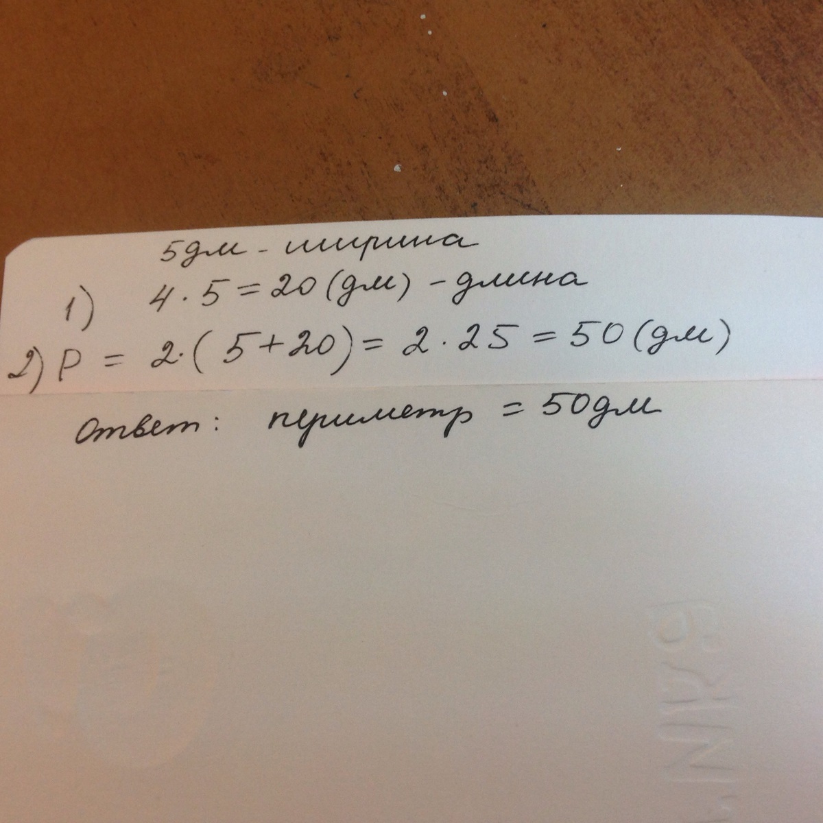 кусок фанеры прямоугольной формы имеет длину в 4 раза больше ширины. ширина этого куска 5 дм. найди периметр куска фанеры.