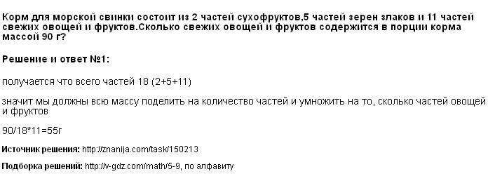 Корм для морской свинки состоит из 2 частей сухофруктов , 5 частей зёрен злаков и 11 частей свежих овощей и фруктов . Сколько свежих овощей и фруктов содержится в порции корма массой 90 г ?