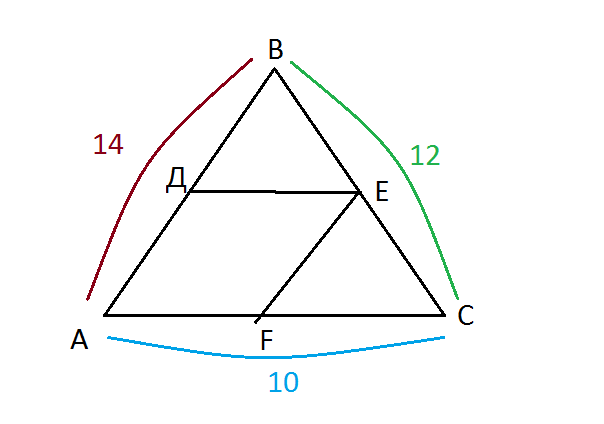 Ромб ADEF вписан в треугольник ABC так, что его вершины D,E,F лежат на сторонах AB,BC,AC соответственно. Найдите отрезки BE и EC, если AB=14, BC=12, AC=10