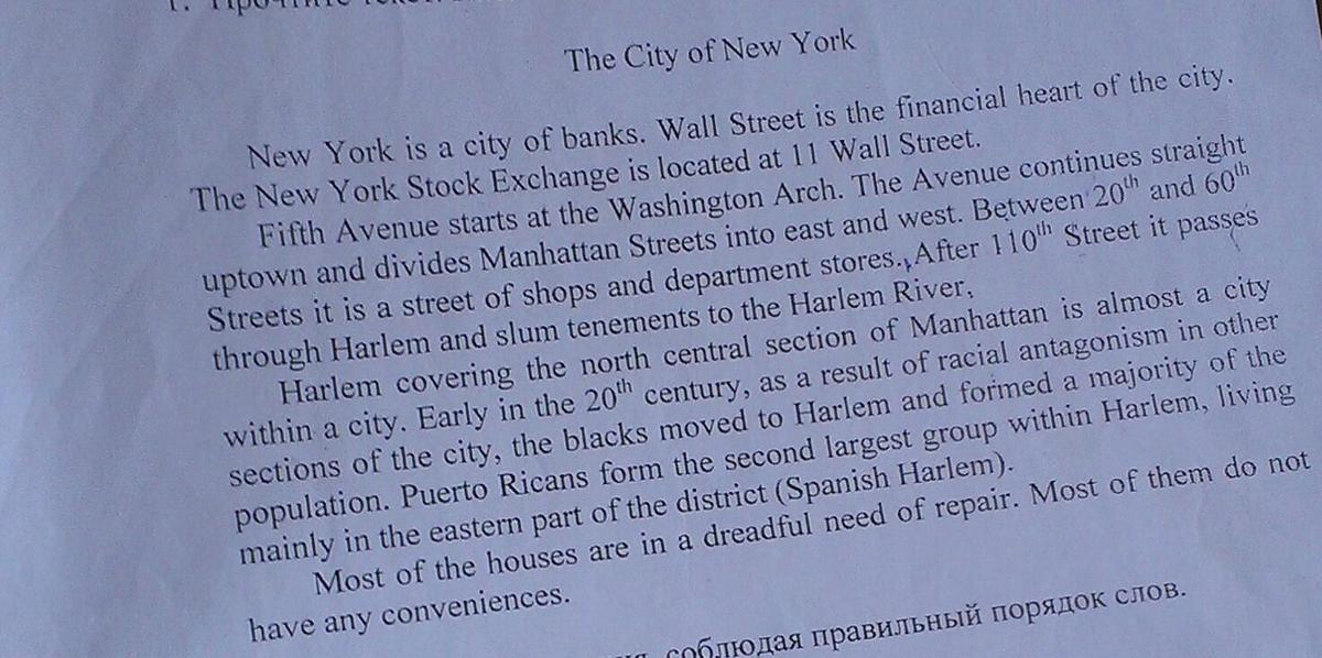 Нью-Йорг - это город банков. Уолл стрит - это финансовое сердце города. Нью-Йоркская фондовая биржа расположена на 11 Уолл стрит.