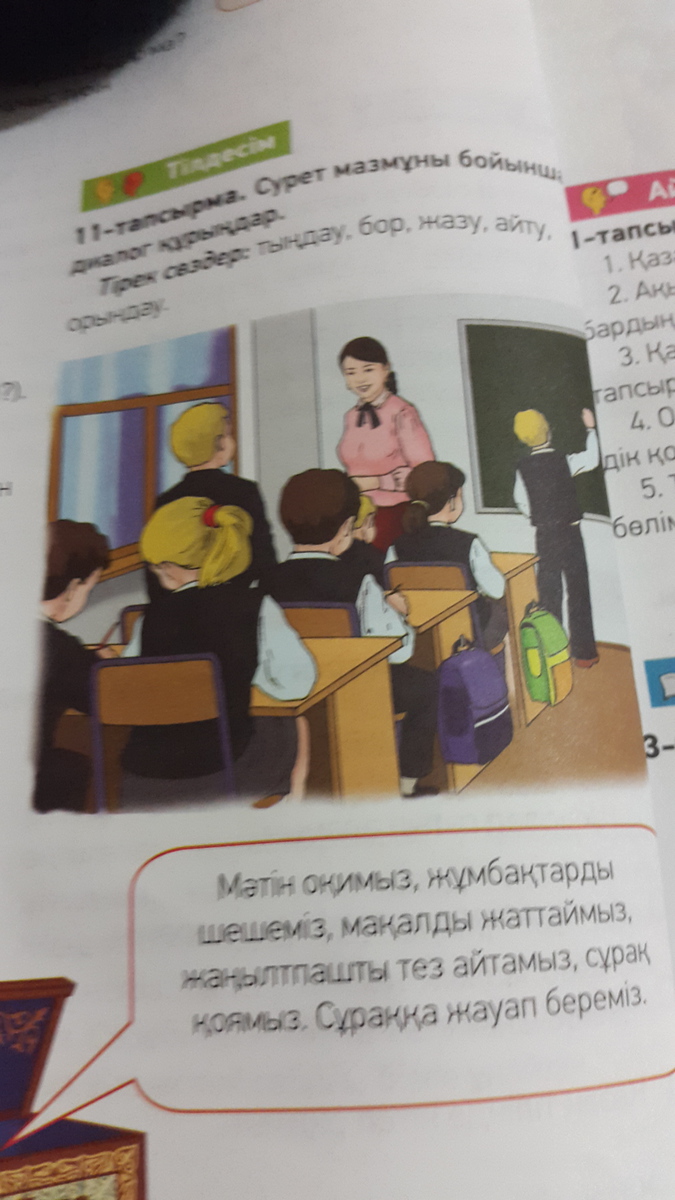 бул биздин сынып. биз казак тили мугалимди тындап отырмыз. Саша тактада бормен жазып тур. Леша сабак айтып тур. Баскалары тапсырманы даптерге орындауда.