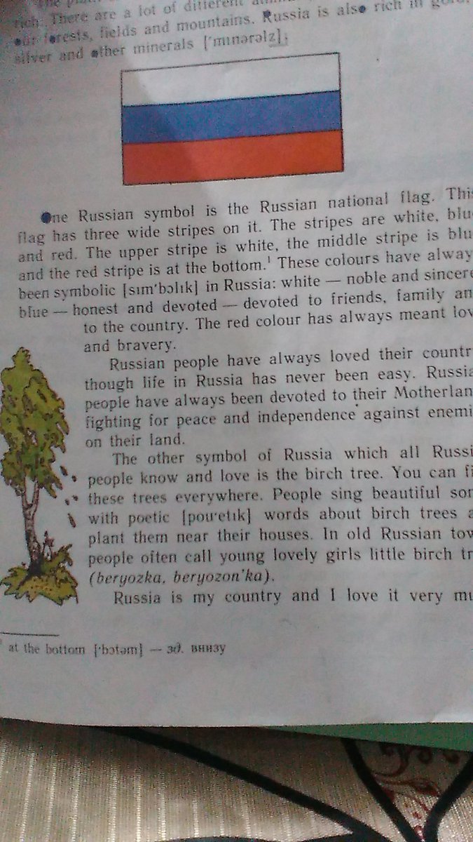 Российский символ - это его национальный флаг. Флаг имеет три широких полосы - белая, синяя и красная. Верхняя полоса - белая, средняя полоса - синяя, и нижняя полоса - красная. Эти цвета всегда были символичными для России. Белый цвет означает благородность и искренность, синий - честность и преданность - преданность друзьям, семье и стране. Красный цвет всегда означает любовь и храбрость.