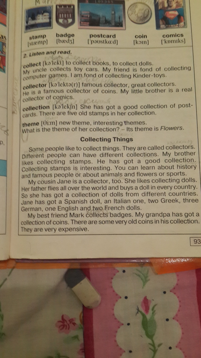 Мой лучший друг Марк коллекционирует значки. Мой дедушка коллекционирует монеты. В его коллекции есть несколько старинных монет. Они очень дорогие.