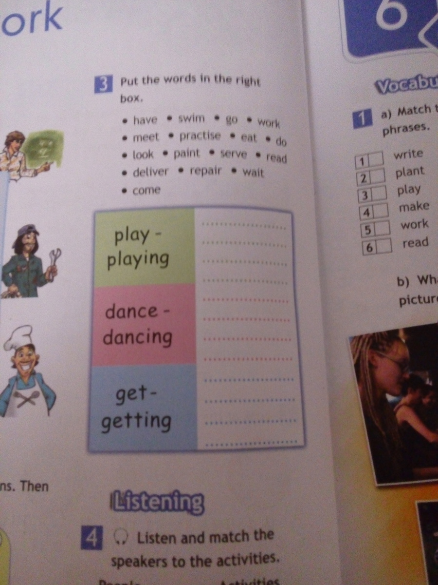 having,swimming, going,working, meeting,practising,eating,doing,looking,painting, serving,reading, delivering,repairing,waiting,coming
