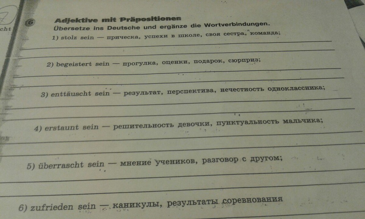 5. zufrieden sein mit (быть довольным) den Ferien, den Leistungen des Wettkampfes