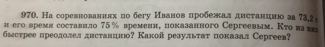 На соревнованиях по бегу Иванов пробежал дистанцию за 73,2 с и его время составило 75% времени, прказанного Сергеевич. Кто из них быстрее преодолел дистанцию? Какой результат показал Сергеев?