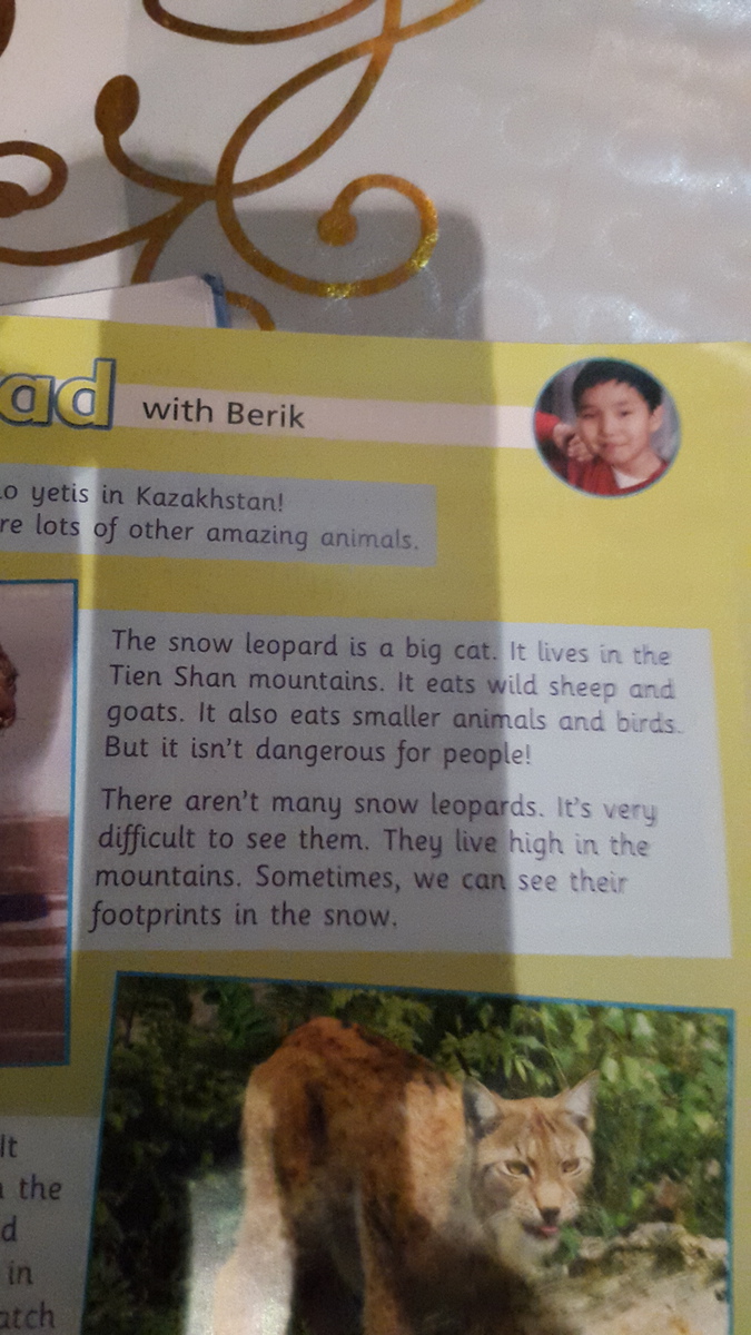 Снежный леопард, это большая кошка. Он живет в Тянь-Шаньских горах. Он ест диких овец и коз. Также ест маленьких животных и птиц. Но он не опасен для людей!