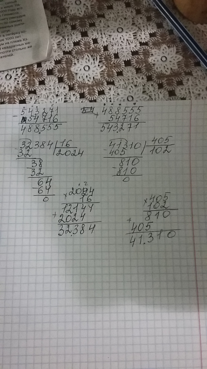 вычисли значение разности чисел 543271 и 54716сделай проверку правильности вычесления с помощью действия сложения и действия вычитания все вычесления выполни столбиком.другая задача .вычисли значения частных у данных пар 32384и16 потом 41310и405 сделай проверку правильности вычесления с помощью действия умножения все вычесления выполни столбиком