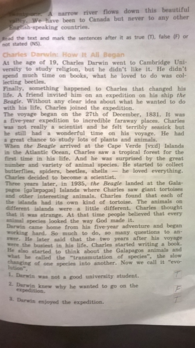 Три года спустя, в 1835 (в тексте опечатка, неверная дата!!), Бигль прибыл на Галапагосские острова, где Чарльз увидел гигантских черепах и других удивительных животных. Чарльз обнаружил, что каждый остров имеет свой собственный вид черепах. Животные на разных островах отличались немного. Чарльз подумал, что это странно. В то время люди думали, что каждый вид животного выглядит так, как создал его Бог.