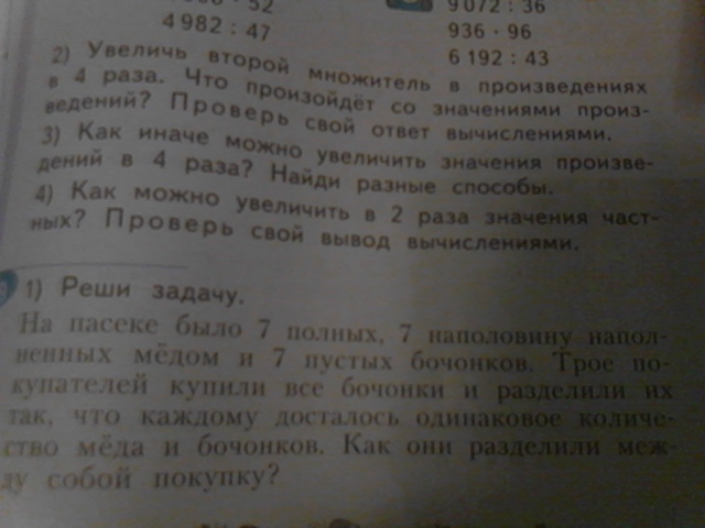 из первых 7 бочонков переливаем половину меда в 7 пустых и каждому по 7 на половину наполненных бочонков