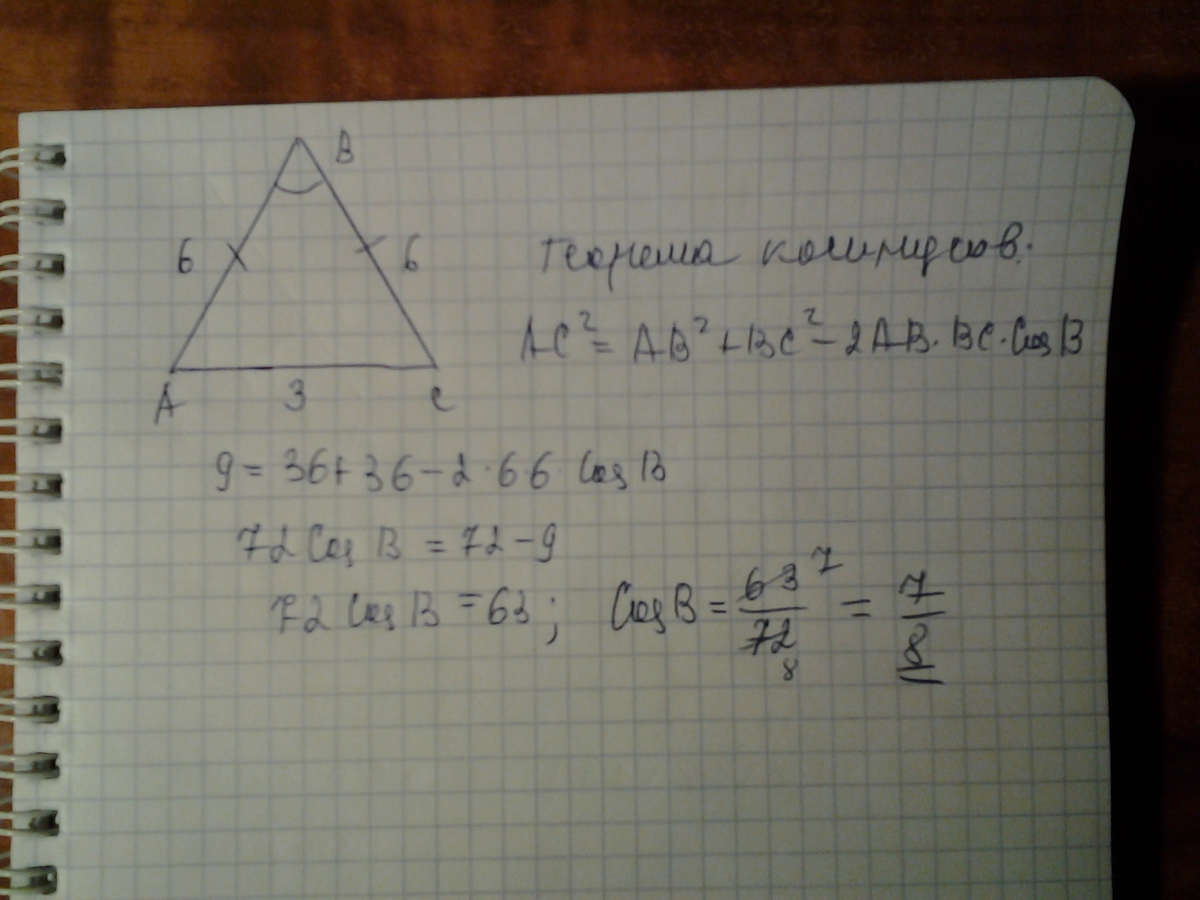 основание равнобедренного треугольника равно 3, боковая сторона 6. Найти косинус угла, противолежащего основанию.