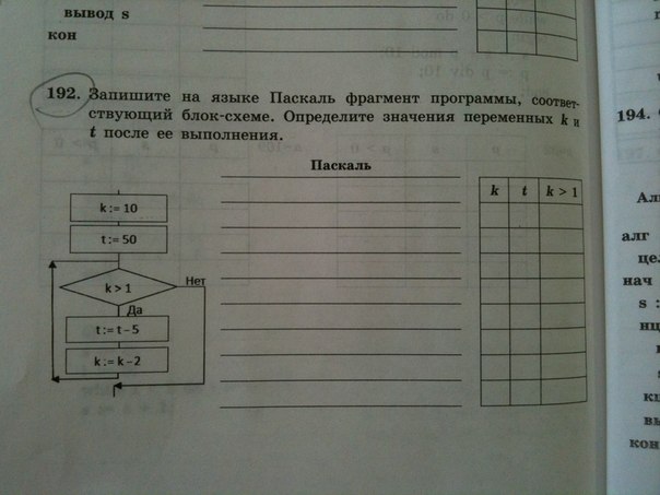 Запишите на языке Паскаль фрагмент программы, соответствующий блок-схеме. Определите значение переменных k и t после ее выполнения.