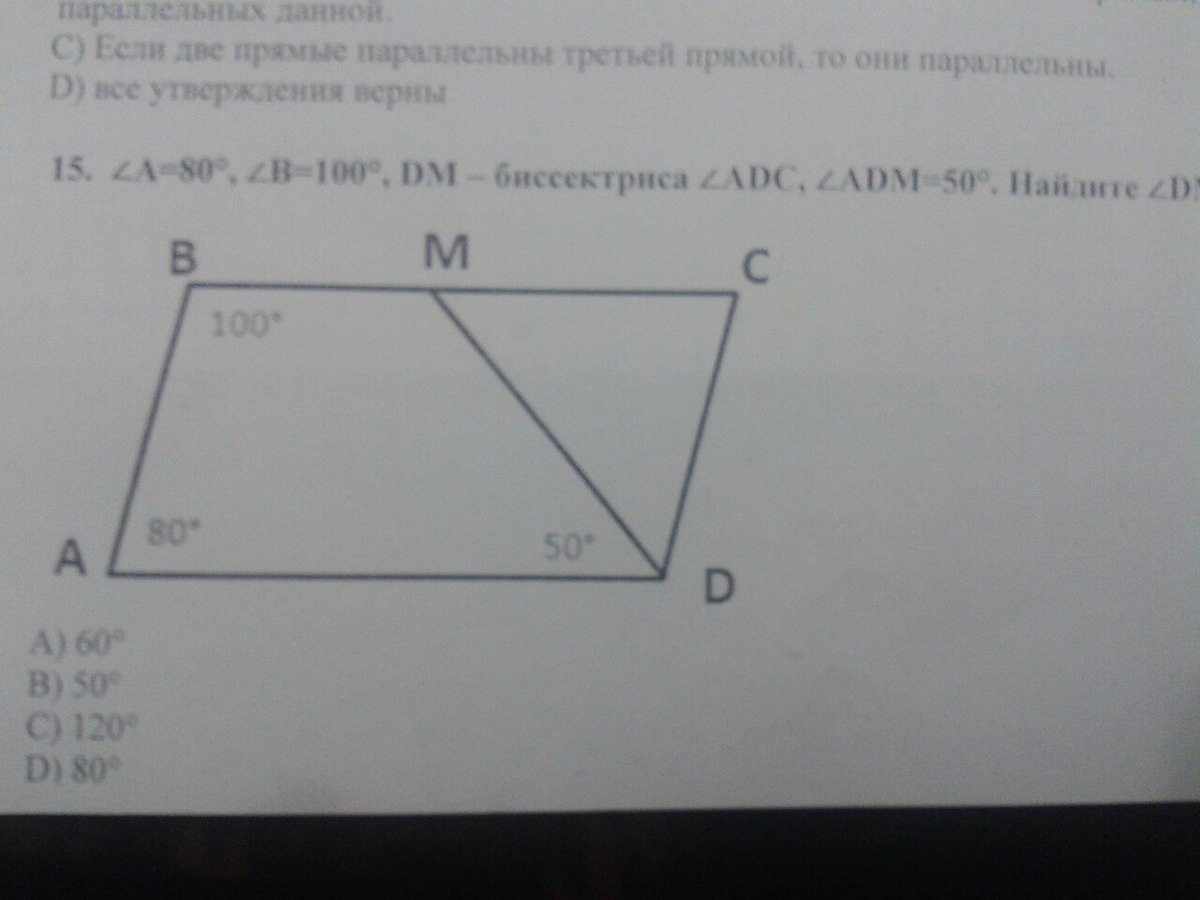 Помогите пожалуйста! Угол A=80 градусов, угол B=100 градусов, DM-биссектриса угла ADC, угол ADM=50 градусов. Найдите угол DMC