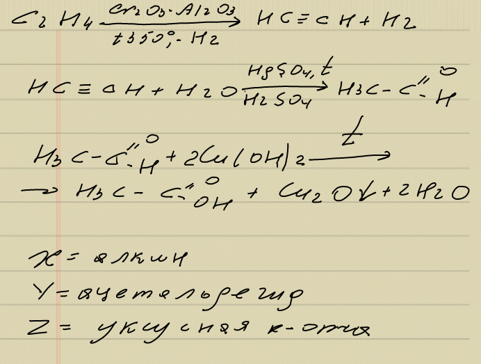 Помогите решить цепочку и найти неизвестные переменные. XYZ C2H4-alo3->X+H2O-ионы ртути->Y+Cu(OH)2—>Z