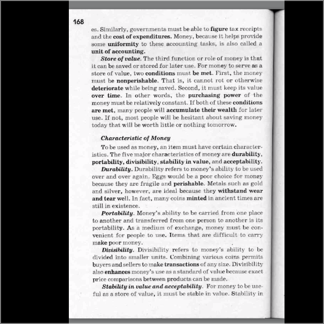 Стабильность в стоимости и приемлемость. Для денег, чтобы быть полезным в качестве средства сбережения, они должны быть стабильны в стоимостном выражении. Стабильность в стоимости побуждает делать сбережения и поддерживает покупательную способность денег. Большинство людей, которые экономят деньги уверены, что они будут иметь примерно такое же значение, когда они захотят что-то купить на них, как это было, когда они положили их в сбережения.