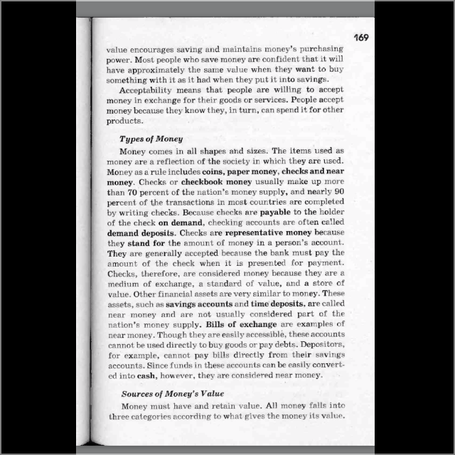 Чеки, следовательно, считаются деньгами, потому что они являются средством обмена, стандартом стоимости и средством сбережения. Прочие финансовые активы очень похожи на деньги. Эти активы, такие как сберегательные счета и срочные депозиты называются полуликвидами и, как правило, не рассматриваются как часть денежной массы страны.