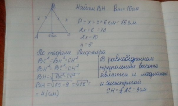 в равнобедренном треугольнике основание равно 6 его периметр равен 16 найдите длины высоты,опущенной на основание