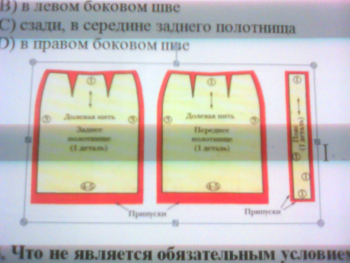 Пожалуйста помогите тест по технологии очень срочно!!!: не могу ответить на вопрос: 12. Перед вами детали кроя прямой юбки. Где должна распола¬гаться застежка «молния» в данном швейном изделии?