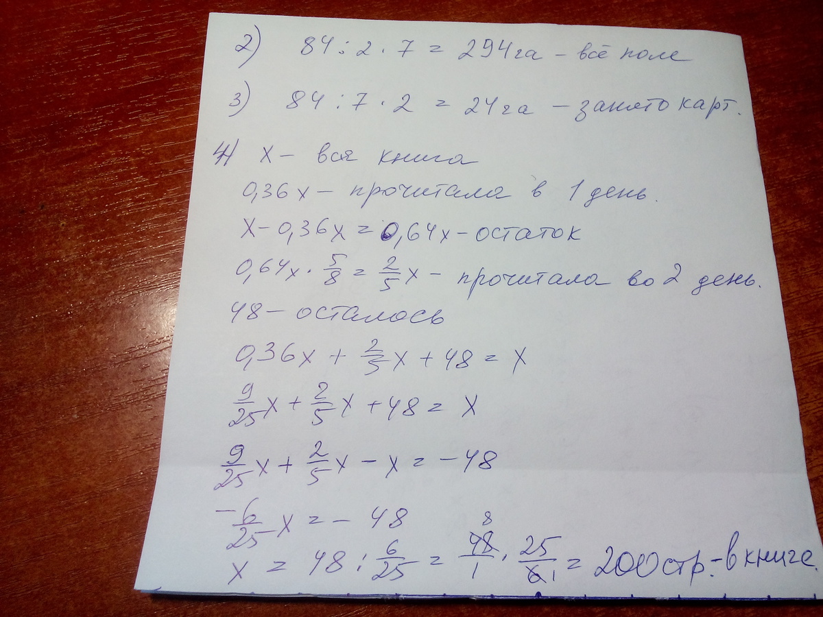 1. Считая, что p = 3,14, определите длину окружности и площадь круга, если радиус R = 5 см. 2. Кукурузой занято 84 га, что составляет площади всего поля. Определите площадь поля. 3. Площадь поля 84 га, из них занято картофелем. Определите площадь, занятую картофелем. 4. В первый день Маша прочитала 36% книги, а во второй остатка, после чего ей осталось прочитать 48 страниц. Сколько страниц в книге? 5. Вычислите: 8× 2 – 10× 3.