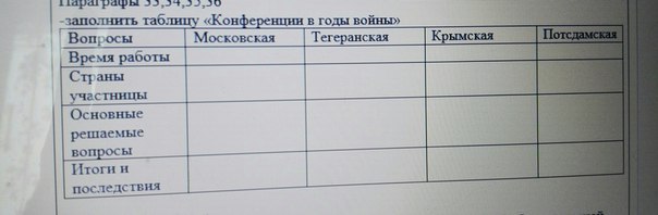 Постдамская 17 июля - 2 августа 1945; СССР, США, Англия; послевоенное состояние Германии, территориальные претензии, разделение Кореи, флот Германии, вступление СССР в войну с Японией на стороне союзников.Тегеранская, 28 нобря-1 декабря 1943; СССР, США, Англия; открытие второго фронта, польский вопрос, послевоенное состояние Европы, безопасности мира после войны.Крымская 4-15 февраля 1945 , СССР, США, Англия; передел границ, репарации, Польша, Германия, дальний восток, ООН. Московская - 1943 - 19-30 октября; СССР, США, Анлгия; обсуждали открытие второго фронта, послевоенное состояние Европы.