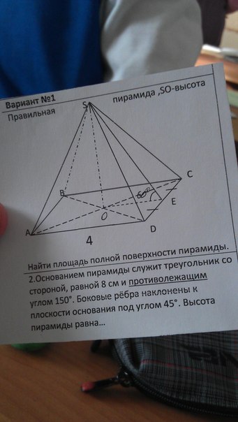 площадь полной поверхности= площади основания (4*4=16)+ 4*площадь треугольника СDS