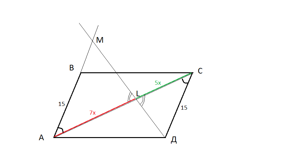 Дано:АВСD-параллелограмм AL:LC=7:5,AB=15см Найдите: а)ВМ б)отношение площадей треугольников АМL и CDL. 1.