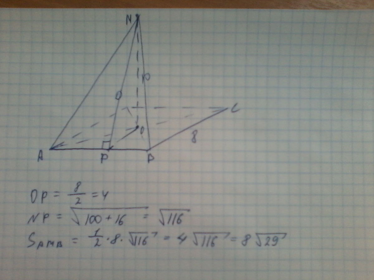 Из центра О квадрата АВСD со стороной 8 см к его плоскости восстановлен перпендикуляр ОМ длиной 10см.Найдите площадь треугольника АВМ.