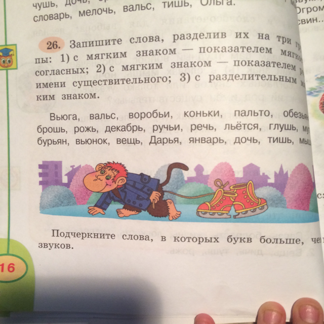 3) С разделительным мягким знаком: вьюга, воробьи, обезьяна, ручьи, льётся, бурьян, вьюнок, Дарья.