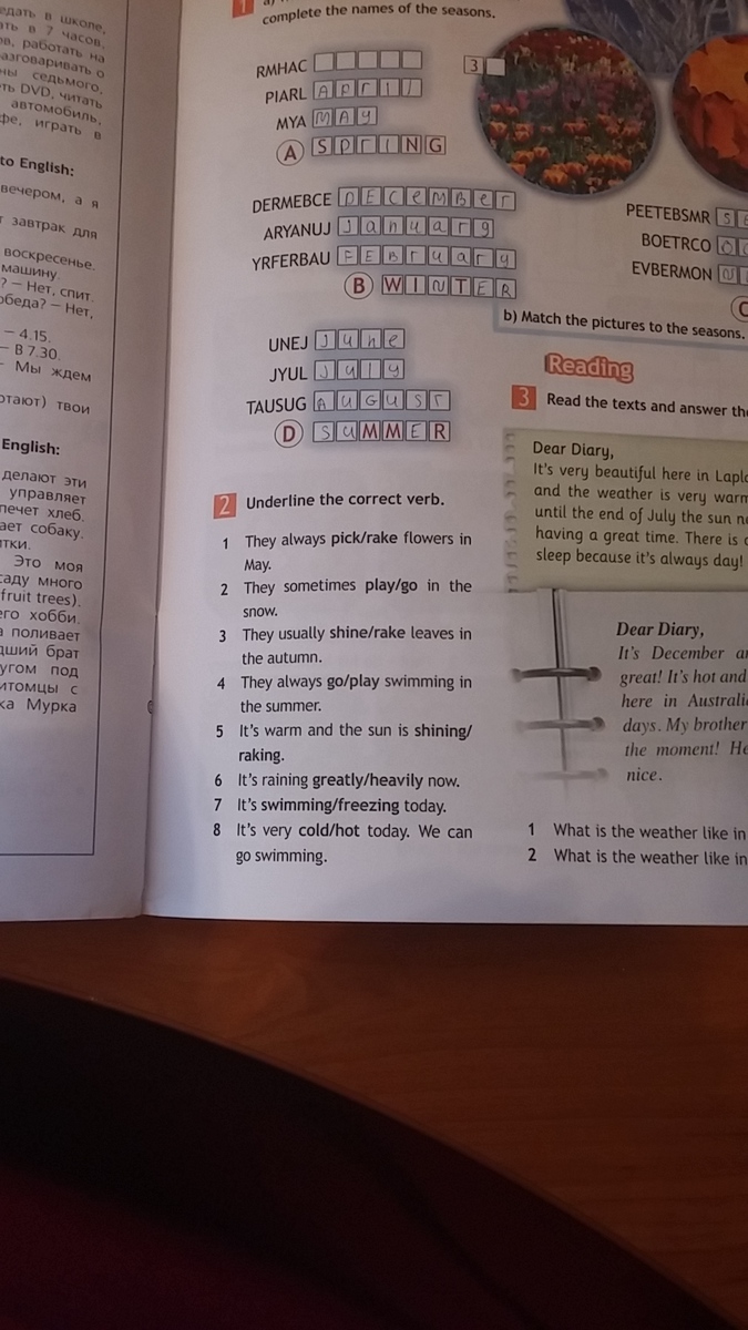 Pick, play, rake, go, shining, heavily, freezing, hot