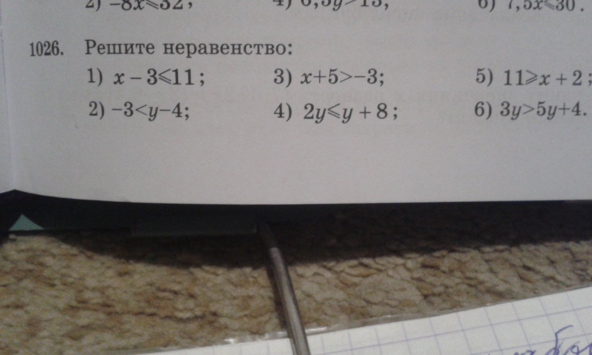 1)x<11+3 2)-y<-4+3(на -1) 3)x>-3-5 4) 2y-y<8 5)-x>2-11(на -1) 6) 3y-5y>4