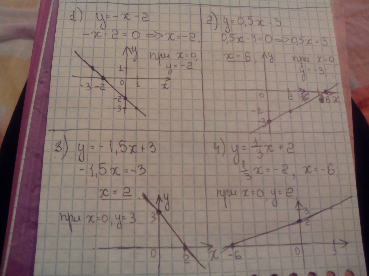 Постройте график функции.Найдите координаты точек пересечения графика с осями координат.1)у=-х-2 2)у=0,5х-3 3)у=-1,5х+3 4)у=1/3х+2 Заранее спасибо!