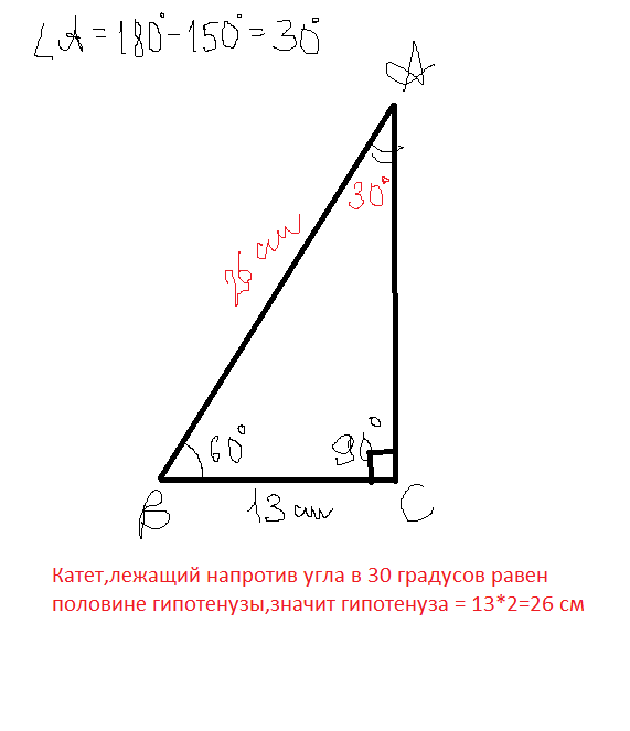 Угол находить по теореме о сумме углов треугольника. Угол равен 30°.