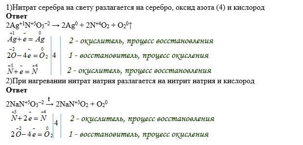 1)Нитрат серебра на свету разлагается на серебро,оксид азота (4) и кислород ответ......................................................................................................................................... 2)При нагревании нитрат натрия разлагается на нитрит натрия и кислород ответ.................................................................................................................