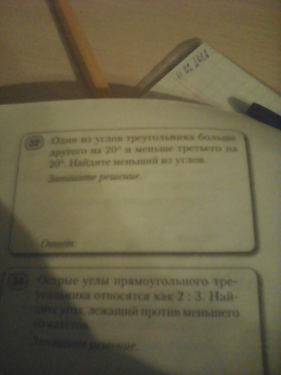 32) Сумма углов треугольника - 180, делим на три, будет 180/3=60. Один из углов больше на 20, прибавляем.. 60+20=80, чтобы сумма (180) не изменилась, от другого угла эти же 20 отнимаем 60-20=40. Получилось 3 угла: 40, 60, 80, где 60 больше 40 на 20 и меньше 80 на 20, как и задано в условии. Меньший угол - 40. Ответ: 40