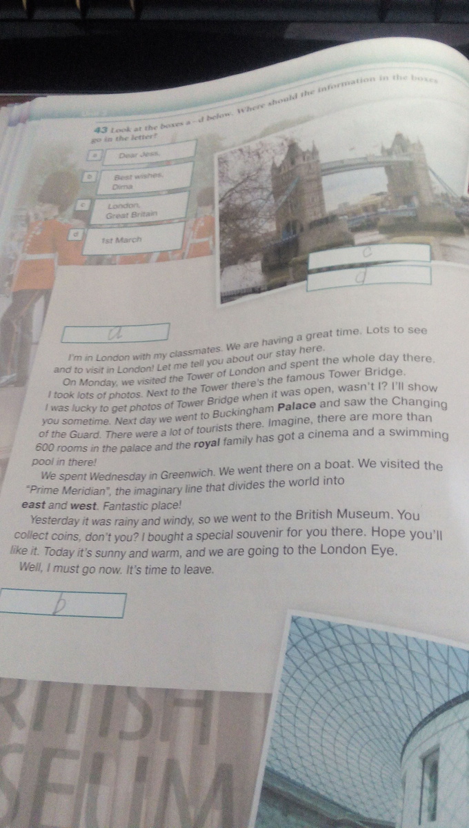 В понедельник мы посетили Лондонский Тауэр и провели там весь день. Я сделала много фотографий. Около Тауэра находится знаменитый Тауэрский мост. Мне повезло сделать фотографии, когда он был разведён, не так ли? Я как-нибудь покажу тебе. На следующий день мы посетили Букингемский дворец и посмотрели на смену стражи. Было очень много туристов. Представь, в дворце есть более 600 комнат, а у королевской семьи был свой кинотеатр и бассейн.