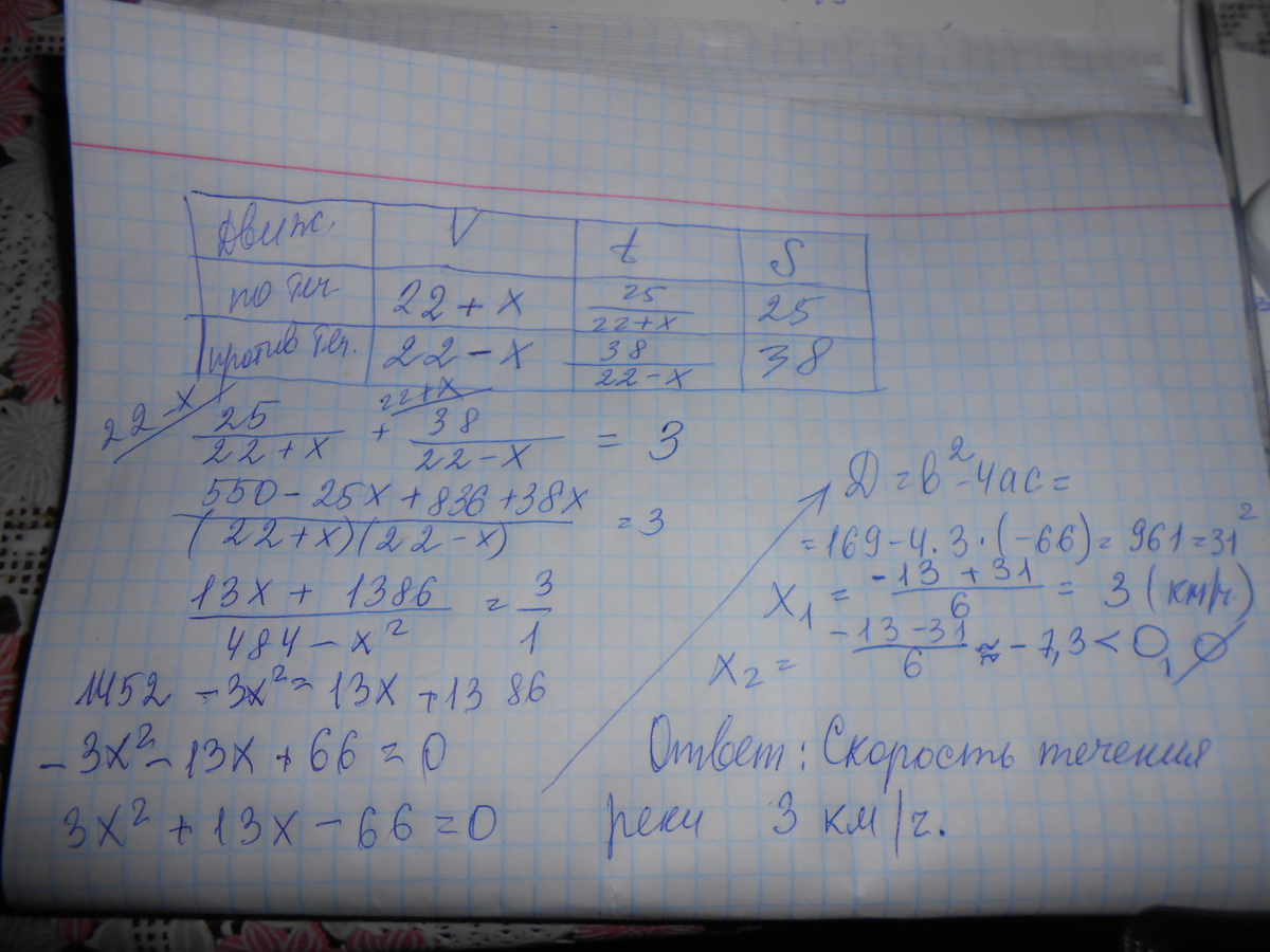 Катер, развивающий в стоячей воде скорость 22 км/ч, прошёл 38 км против течения и 25 км по течению, затратив на весь путь 3 ч. Найдите скорость течение реки.