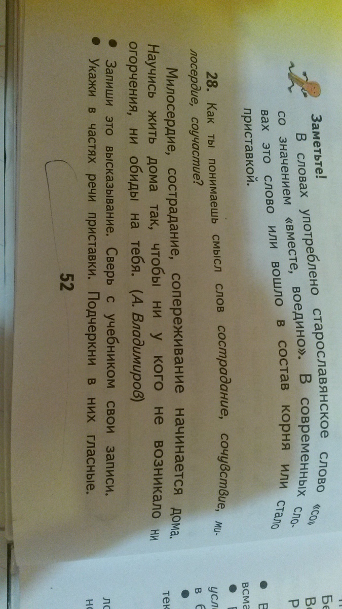 Как ты понимаешь смысл слов сострадание сочувствие милосердие соучастие?Запиши это высказание.Сверь с учебником свои записи.Укажи в частях речи приставки.Подчеркни в них гласные.