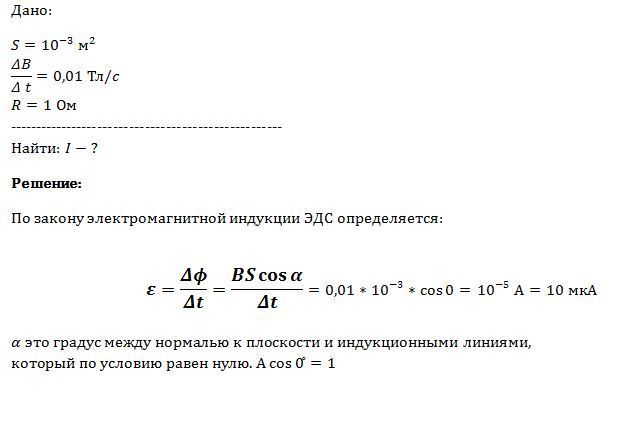 В однородном магнитном поле находится плоский виток площадью 0,001 м2, расположенный перпендикулярно линиям поля. Чему будет равна сила тока (в мкА) в витке, если индукция поля будет убывать с постоянной скоростью 0,01 Тл/с? Сопротивление витка 1 Ом.