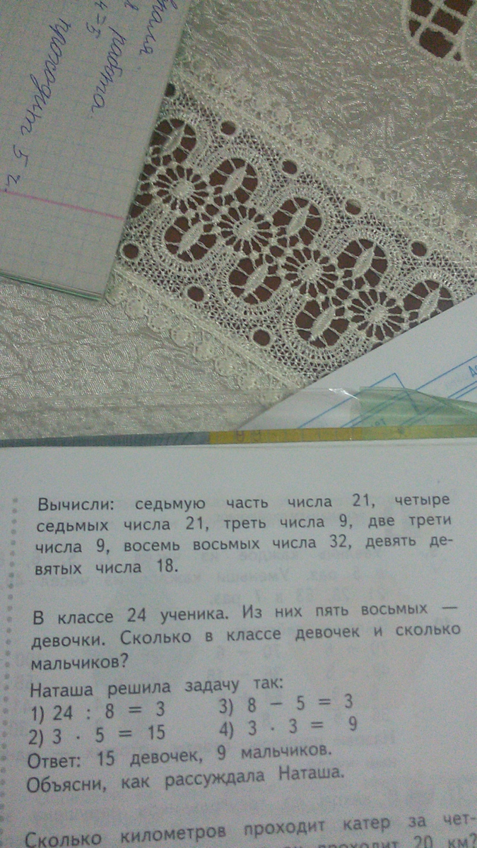 вычислить седьмую часть числа 21 четыре седьмых числа 21 3 числа 9 2 3 числа 9 8 8 числа 32 девять девятых числа 18 решение