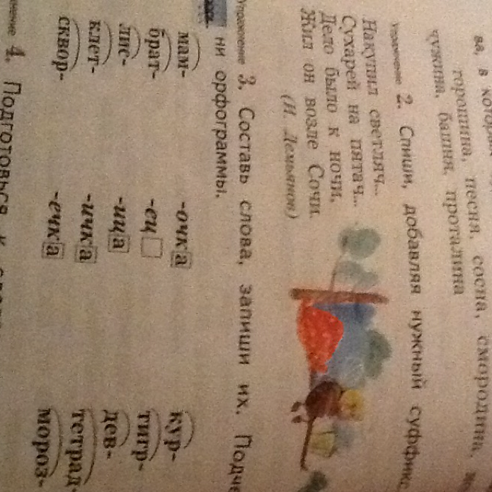 мамочка( суф. очк), братец( суф. ец), лисица(иц), клеточка(очк), скворец(ец), курочка(очк), тигрица(иц), девочка(очк), тетрадочка(очк), морозец(ец).