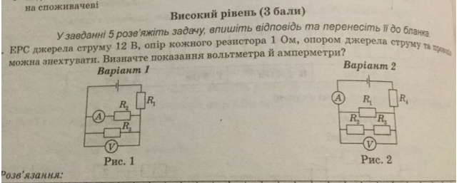 Общее сопротивление цепи R0=R+R*(R+R)/(R+R+R)=R+2R²/3R=R+2R/3=5R/3=5*1/3=5/3 Ом, тогда ток в неразветвлённой части цепи I=E/R0=12/(5/3)=36/5 А. Так как амперметр стоит в неразветвлённой части цепи, то он покажет это же значение - 36/5, или 7,2 А. Напряжение на зажимах вольтметра U=E-I*R=12-36/5*1=24/5 В, т.е. вольтметр покажет 24/5=5,8 В.