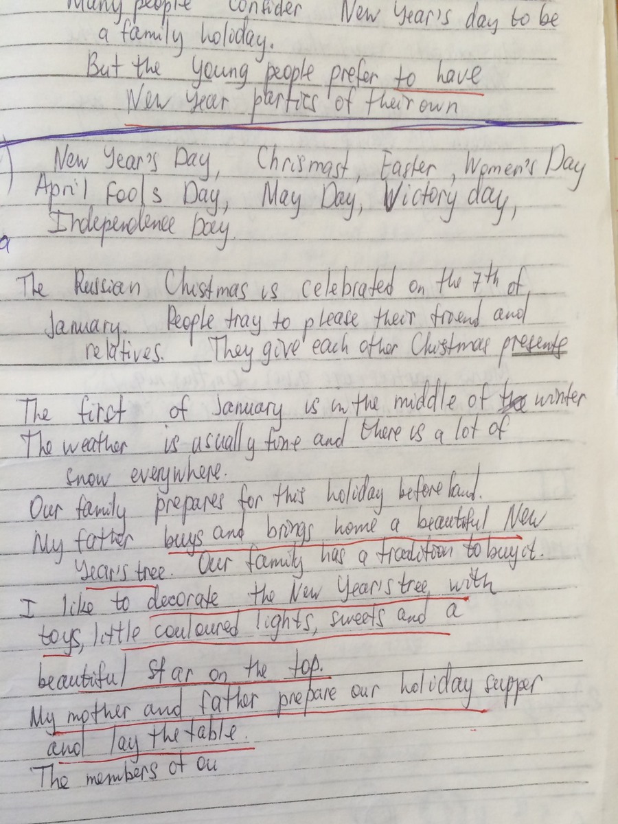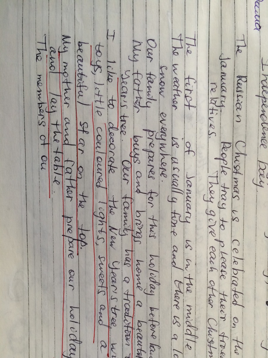I like to decorate the New Year's Tree with toys, little coloured lights, sweets and a beautiful star on the top. My mother and father prepare our holiday supper and lay the table.