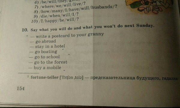 Все предложения начинаешь с I will / I won`t , заканчиваешь соответственно next Sunday. глаголы после will и won`t будут в данных формах. А какие действия ты будешь делать в "следующее воскресенье" уже на твое усмотрение.
